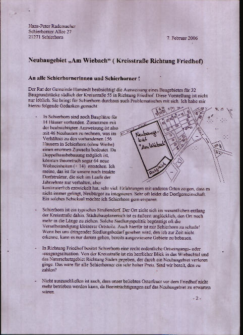 2006 Neues vom Wiebach Am Dienstag, 12.12.2006 um 18:15 tagt der Bauausschuss der Gemeinde Hanstedt gemäß NHW im Schierhorner Feuerwehrhaus, gemäß Wurfzettel der "Interessengemeinschaft Schierhorn" im Schützenhus. Im Mittelpunkt steht der Bebauungsplan "Am Wiebach". |