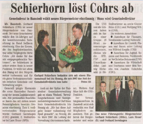 11.September 2011 Kommunalwahlen in Niedersachsen, im Landkreis Harburg - und somit auch in Schierhorn Wahlergebnisse / Stimmen für Schierhorner / Weiher Kandidaten (I.v.): Die Schierhorner/Weiher Kandidaten haben sich nach Stimmanteilen wie folgt entwickelt: Gemeinde Hanstedt Christian Blecken (269 in 2006 und 208 in 2011) ist im neuen Gemeinderat vertreten Gerhard Schierhorn (0 in 2006 und 262 in 2011) ist im neuen Gemeinderat vertreten Jörg Gehrigk (161 in 2006 und 110 in 2011) Tobias Rohde (0 in 2006 und 36 in 2011) Samtgemeinde Hanstedt Christian Blecken (379 in 2006 und 268 in 2011) ist im neuen Samtgemeinderat vertreten Gerhard Schierhorn (0 in 2006 und 616 in 2011) ist im neuen Samtgemeinderat vertreten Tobias Rohde (0 in 2006 und xx in 2011) Stimmanteil 2011 war nicht zu ermitteln, ist auf jeden Fall nicht im Samtgemeinderat Zum neuen Samtgemeindebürgermeister für unsere Samtgemeinde Hanstedt wurde OLAF MUUS gewählt |